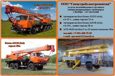 стрела 21м, автокрана на базе Камаз (6х6) г/п 25т – стрела 28м, автовышка 18м. Работаем