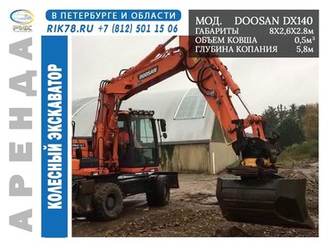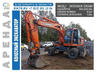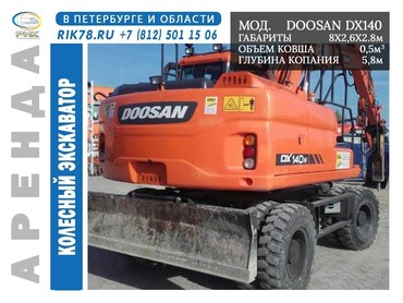 Предлагаем организациям и частным лицам в аренду на смену или длительный срок колесный экскаватор Doosan DX140LC со стрелой 6 метров и ковшом 0,5 куба. Техника предоставляется с экскаваторщиком, топливом, доставкой на объект и вывозом на трале. Минимальная смена 8 часов.Дополнительное оборудование: гидромолот, планировочный ковш