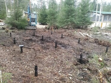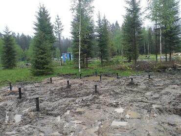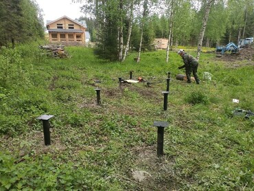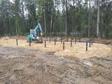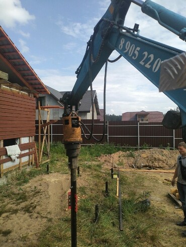 Закручиваем винтовые сваи мини экскаватором.